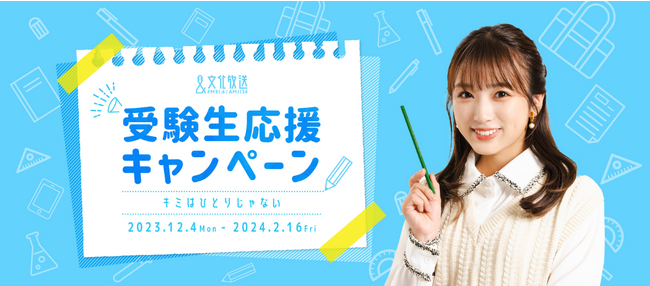 文化放送は、『大学受験ラジオ講座』から『レコメン!』まで中高生から厚い支持を受けてきたラジオ局として、このたび受験生リスナーにエールを送る「~キミはひとりじゃない~文化放送 受験生応援キャンペーン」を、12月4日(月)から2月16日(金)までの約2ヵ月半にわたって実施します。