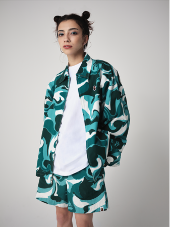 A BATHING APE(R)のレディースラインでは、カレッジ・アウトドア・ヒップホップの3カテゴリーに集約して表現したコレクション。パステルカラーとアースカラー、そこに印象的な色柄のグラフィックやデザインを落とし込むことで、フェミニンとマスキュリン、両面のファクターを内包させたカラフルなコレクションを展開します。