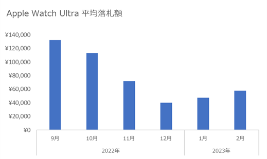 Apple Watch Ultraのオークション市場における平均落札価格は、定価より半額以上安い¥57,782となりました。Apple Watch Series8やSE2と比べ、お得に落札できることが分かりました。