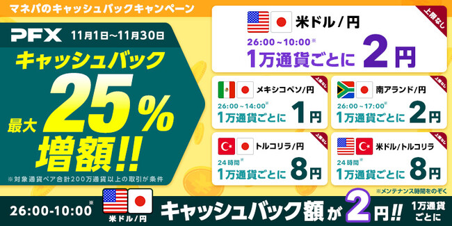株式会社 マネーパートナーズ(代表取締役社長:福島秀治、本社:東京都港区、以下「当社」)では、11月1日より『パートナーズFX』にて、対象通貨ペアのお取引に対し、キャッシュバックを実施いたします。