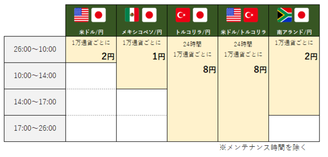 なお、「トルコリラ/円」・「米ドル/トルコリラ」は、24時間すべてのお取引でキャッシュバックをお受け取りいただけます。 ※メンテナンス時間を除く