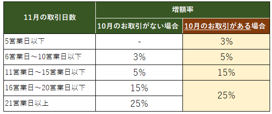 さらに、期間中にキャッシュバック対象となる取引をされた日数に応じて、最終キャッシュバック額から以下の通り増額いたします。