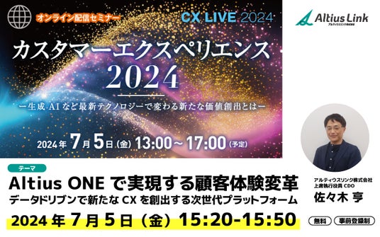 アルティウスリンク株式会社(所在地:東京都新宿区、代表取締役社長:網野 孝、以下 アルティウスリンク)は、“生成AIなど最新テクノロジーで変わる新たな価値創出とは”をテーマとした日経BP 総合研究所 イノベーションICTラボ主催のオンラインセミナー「カスタマーエクスペリエンス2024 ~CX LIVE 2024~(2024年7月5日(金)開催)」に登壇いたします。