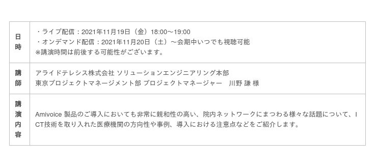 本イベントでは、特別講師を迎えたライブ配信と、医療現場の現状を反映したAmiVoiceの「現在」をお届けするオンデマンド配信がございます。