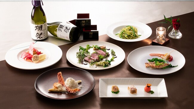 「リストランテ カフェ チリエージョ」にて、日本酒の銘柄「獺祭」を使用したメニューの数々をご堪能いただけるレストランプラン。デザートにはForbes記念マカロンを添えた、全6品のフルコースをご用意いたしました。本レストランプランが付いた宿泊プランも販売いたします。