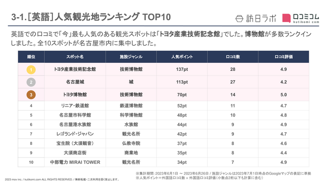 英語での口コミで「今」最も人気のある観光スポットは「トヨタ産業技術記念館」でした。博物館が多数ランクインしました。全10スポットが名古屋市内に集中しました。
