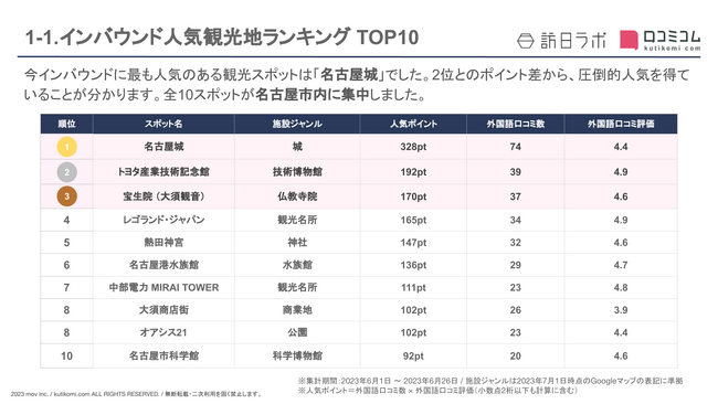 国内最大級メディア『訪日ラボ』及び 口コミサイトを”もっと”売上に変える店舗支援SaaS「口コミコム」を運営する株式会社mov(代表取締役:渡邊 誠、本社:東京都渋谷区、以下mov)は、観光名所に寄せられた最新の口コミデータから、独自の『インバウンド人気観光地ランキング』を発表しました。