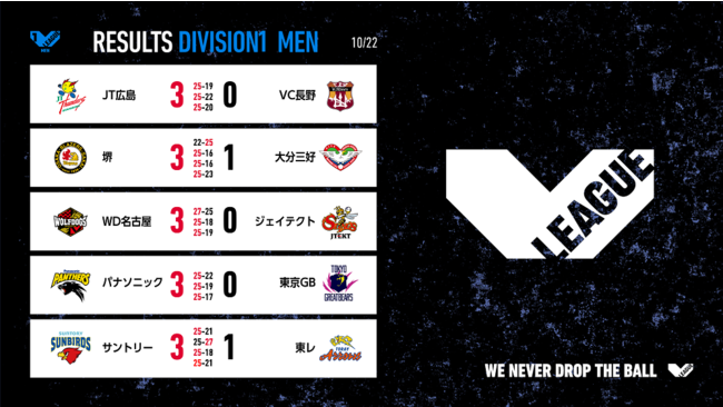 バレーボール国内最高峰リーグV.LEAGUE【10月22日の試合結果】