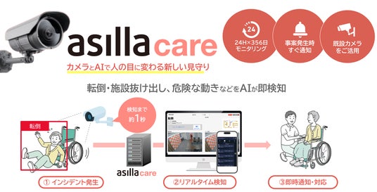 「asilla care」は、施設内の既設防犯カメラ映像をAIがリアルタイムで解析し、入居者の転倒・徘徊・ふらつきなどの異常をすばやく検知するシステムです。