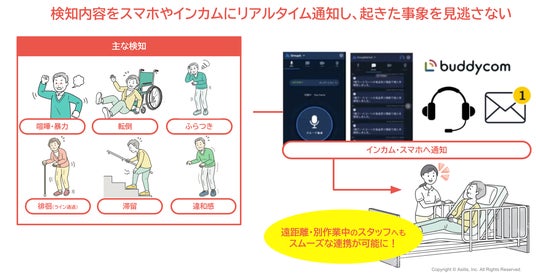 他の入居者の対応中や夜勤帯でも、転倒や徘徊をAIが検知します。