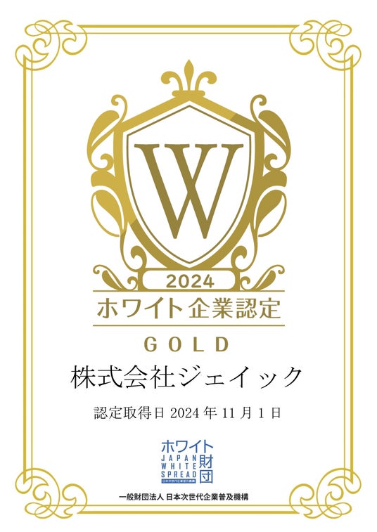 企業向けの教育研修事業と若年層向けの就職支援事業を展開する株式会社ジェイックは、一般財団法人日本次世代企業普及機構が運営する「ホワイト企業認定 ゴールドランク」を2024年11月1日に取得しましたことをお知らせいたします。