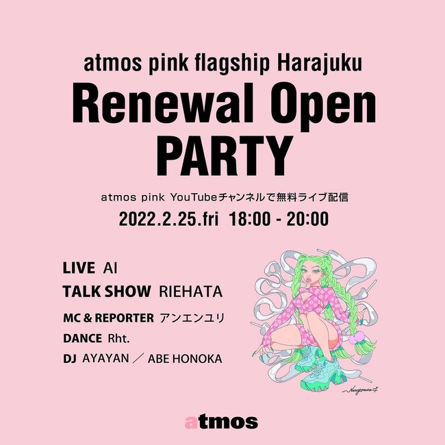 2/23(Wed)にニューアルバム『DREAM』をリリースするAI。GUEST DANCEは、今回DIGITAL & APPに新設されたDANCEカテゴリー“atmos pink academy”第一弾ダンサーとして登場したRht.。彼らと撮ったスペシャルなムービーもパーティーのオープニングで公開するのでお楽しみに♪ そして、Rht.をプロデュースするRIEHATAが、TALK SHOWには登場!atmos pinkとのコラボ商品の話などここでしか聞けない話。MC兼配信レポーターには、アンエンユリ! 彼女たちに新しく生まれ変わったatmos pink flagship Harajukuの店内をレポートしてもらいます。