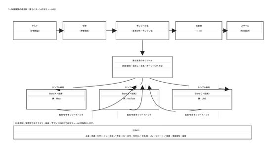 画像・短尺動画・サムネ・コピーをパーツ化し、1→Nでブランド・媒体へ迅速に再利用。テスト→学習→スケールのリードタイムを短縮。