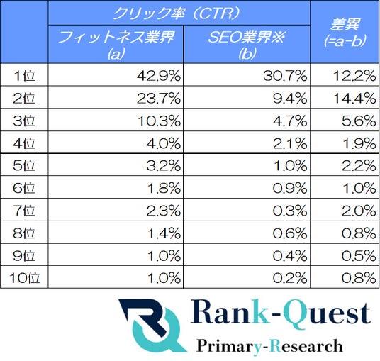 SEO対策支援実績4,300社超のランクエスト(https://rank-quest.jp/column/column/how-to-seo/ )は、2025年10月にフィットネス業界のクライアントサイトを対象とした「検索順位別のクリック率(CTR)」調査を実施しました。