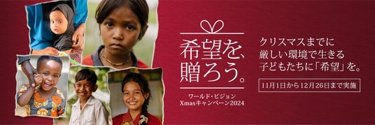 世界の子どもを支援する国際NGOワールド・ビジョン・ジャパン(事務局:東京都中野区、事務局長:木内真理子/WVJ)は、本日11月1日から12月26日まで、クリスマスキャンペーン2024「希望を、贈ろう。」を展開し、厳しい環境で生きる子どもたちにクリスマスまでに「希望」を届けることを願い、継続支援プログラム「チャイルド・スポンサーシップ」や「クリスマス募金(水・食糧支援)」への協力を呼びかけます。クリスマスキャンペーン期間中にはイベントも実施予定。イベント参加など、WVJの活動を広めてくださる方に、オリジナルステッカーをお配りします。キャンペーン詳細は公式ホームページ(https://www.worldvision.jp)へ。多くの皆さまのご参加をお待ちしております。