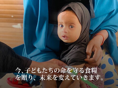 深刻な干ばつや長引く紛争により食糧不足は深刻化、飢餓人口が拡大しています。急性栄養不良に苦しむ5歳未満児は世界で4,500万人にのぼります。栄養不良が免疫力の低下を招き、下痢や肺炎など予防治療可能な病気で子どもたちが命を落としています。子どもたちの命を守る食糧を今届け、未来を変えていくために、水・食糧支援のための「クリスマス募金」へのご協力をお願いしています。