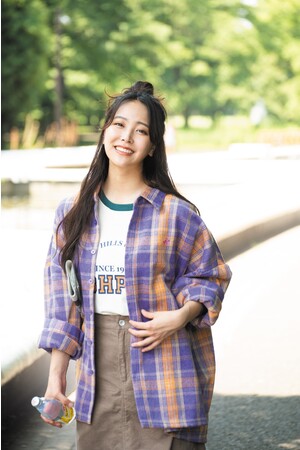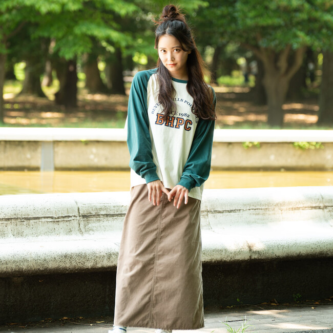 ラグラン×アメカジプリントで、トレンドの古着感を出しました。