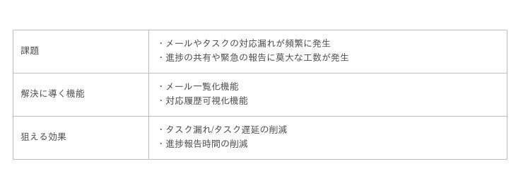 1. メールの問い合わせの一元管理や進捗管理を実現