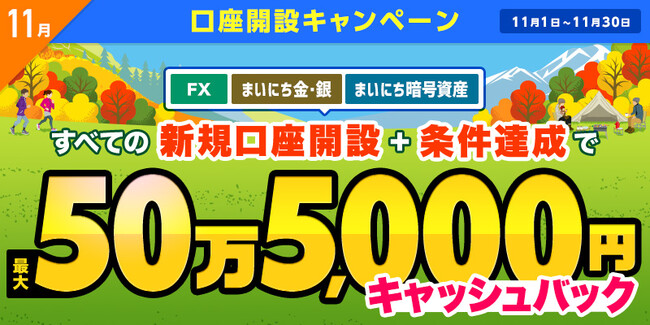 FX(パートナーズFX、パートナーズFXnano)、の取引高に応じて最大30万円、まいにち金・銀、まいにち暗号資産の各取引高に応じてそれぞれ最大10万円、合計で最大50万円キャッシュバックいたします。
