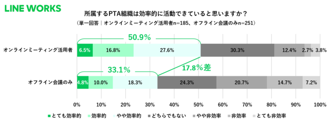 オンラインミーティング活用者の50.9%が「効率的なPTA活動ができている」と回答、オフラインのみで会議をする人より17.8pt多い結果に