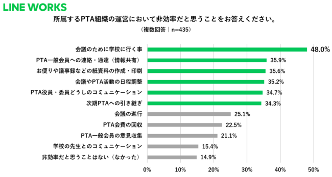 所属するPTA組織の運営において非効率だと思うことを聞いたところ、「会議のために学校に行く事」が48.0%で最も多い結果になりました。2~6位は僅差で、「PTA一般会員への連絡・通達(情報共有)」35.9%、「お便りや議事録などの紙資料の作成・印刷」35.6%、「会議やPTA活動の日程調整」35.2%、「PTA役員・委員どうしのコミュニケーション」34.7%、「次期PTAへの引き継ぎ」34.3%と続きました。