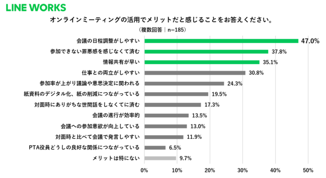 PTA会議でオンラインミーティングを活用していると回答した方のうち、90.3%がそのメリットを感じていることがわかりました。具体的には、「会議の日程調整がしやすい」が47.0%で最も多く、次いで「参加できない罪悪感を感じなくて済む」37.8%、「情報共有が早い」35.1%という結果になりました。