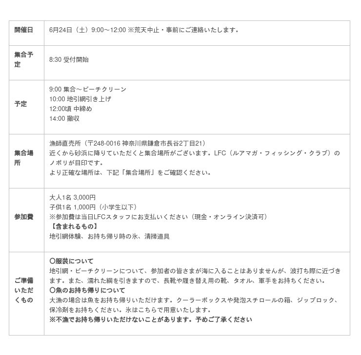 LFC主催の地引き網&ビーチクリーン(海岸清掃)イベントを開催します! 開催日時は6月24日(土)9:00から、場所は鎌倉市由比ヶ浜。地引き網&ビーチクリーン終了後は、海開き直前の砂浜を解放。海水浴をお楽しみいただけます。一足先に夏を満喫できる最高の1日となること間違いなし。ご家族や友人をお誘いあわせのうえ、ぜひご参加ください。