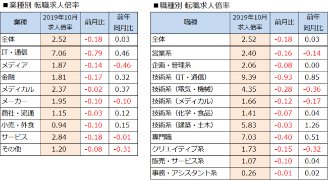 2019年10月の転職求人倍率は、前月比-0.18ポイントの2.52倍となりました。求人数は前月比100.7%、前年同月比105.9%となりました。転職希望者数は前月比107.7%、前年同月比104.6%でした。