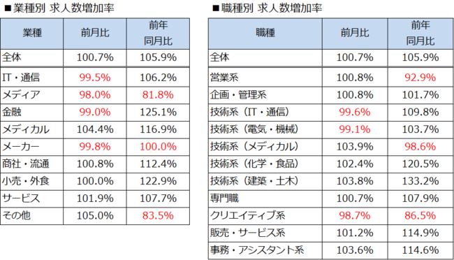業種別では、「その他」以外の8業種のうち「メディカル」「商社・流通」「小売・外食」「サービス」の4業種で求人数が増加しました。求人の増加率が特に高かったのは、「メディカル」(前月比104.4%)、「サービス」(前月比101.9%)でした。職種別では、11職種のうち「技術系(IT・通信)」「技術系(電気・機械)」「 クリエイティブ系」を除く8職種で求人数が増加しました。求人の増加率が特に高かったのは、「技術系(メディカル)」(前月比103.9%)、「技術系(建築・土木) 」(前月比103.8%)でした。