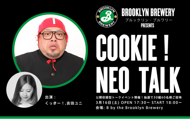 このコーナーの派生イベントとして「BROOKLYN BREWERY presents くっきー!の neo トーク」の開催が決定! くっきー!が普段から親交のあるアートディレクターの吉田ユニを迎えて「カルチャーミックス」をテーマにしたトークセッションをお届けします。3月16日(土)、東京・日本橋兜町にあるBROOKLYN BREWERYの世界初となるフラッグシップショップ『B by the BROOKLYN BREWERY』にて開催します。本イベントに30組60名様をご招待します。