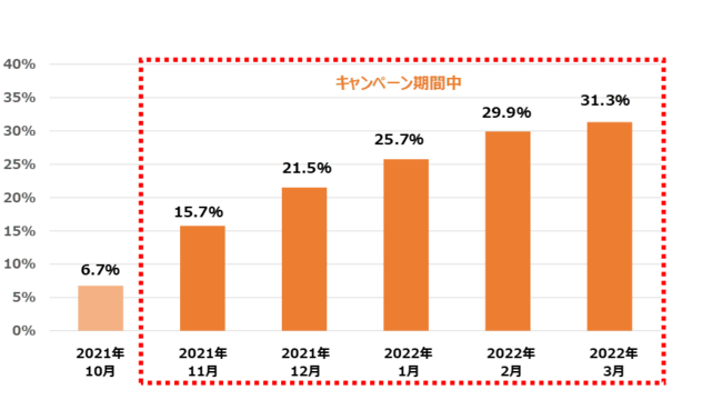 2021年11月1日から実施している「住宅ローン団信上乗せ金利年0.1%引下げキャンペーン」(2022年4月28日終了)が大変好評いただいているため、2022年5月2日から団体信用生命保険の「がん100%保障団信」と「11疾病保障団信」の上乗せ金利を引下げすることになりました。特に「がん100%保障団信」を選択するお客さまの割合が2022年3月には31.3%と、キャンペーン開始前の2021年10月の6.7%から4.6倍に増加しています。