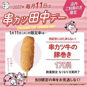 株式会社串カツ田中ホールディングス(本社:東京都品川区東五反田、代表取締役社長:貫 啓二、以下:串カツ田中)は、今後より一層お客様に楽しんでいただくため、2022年の毎月11日を「串カツ田中デー」として、毎月限定の串カツを販売いたします。 「串」の形に見立てた毎月11日の単日限定で、店内利用のお客様のみを対象とした特別串となっております(テイクアウト専門店を除く)。串カツ田中デーの記念すべき1回目となる1月11日(火)は、串カツ牛を豚肉で巻いた「串カツ牛の豚巻き」を販売いたします。お肉好きはもちろん、ボリュームのある串カツとなっているので学生やサラリーマンの方にもご満足いただける商品となっております。