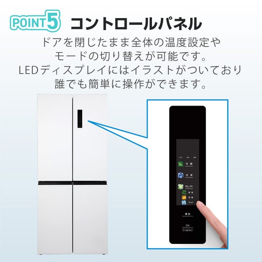 冷蔵室のドアには、冷蔵室、セレクトBOX、冷凍庫の温度を調節できるコントロールパネルが備わっております。食材に合わせて温度やモードを調節することができます。