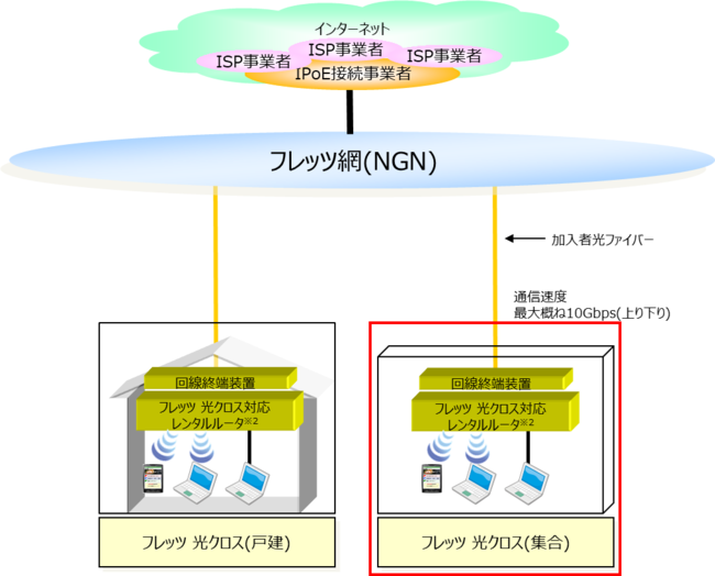 本サービスは、集合住宅において加入者光ファイバーを複数のお客さまで共用し、お客さまが契約するインターネットサービスプロバイダーさま(以下、ISP事業者さま)等へ上り/下り最大概ね10Gbps※2の通信速度で接続するベストエフォートサービスです。