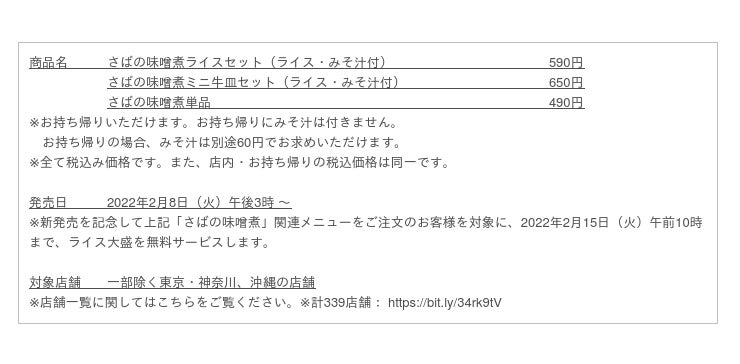 発売を記念して、「さばの味噌煮」関連メニューをご注文のお客様を対象に、2022年2月15日(火)午前10時まで、ライス大盛を無料サービスいたします。