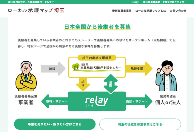 relayと埼玉県事業承継・引継ぎ支援センターが連携し、埼玉県に特化した後継者募集案件を掲載するプラットフォームです。埼玉県内で後継者を募集している事業者のストーリーや想いをオープンネームで公開し、全国から熱意のある後継ぎ候補を募集します。