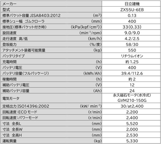 1.定格出力30kWの電動モータと容量39.4kWhのリチウムイオンバッテリを搭載し、エンジン機と同等の作業性能を確保