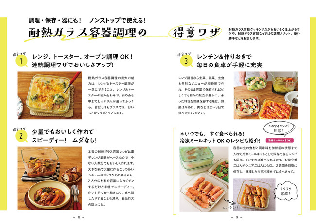 「耐熱ガラスの保存容器」は調理から保存、食卓、片づけまで活用できる優れもの。ガラスのため、見た目がスッキリとして、冷蔵庫の中でも中身が見えて保存に便利なのはもちろんですが、電子レンジとオーブンやトースターの両方の熱源が使えることが優秀なポイント。レシピは材料と調味料を入れ、混ぜ合わせて加熱するだけの手軽なものばかりを紹介しています。