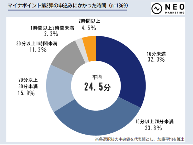 約7割が、申し込んだマイナポイント第2弾。申込みにはどれくらいの時間を要するのでしょうか。実際に申込みにかかった時間をお聞きしました。最も多い回答は「10分以上20分未満」となり33.8%が回答しました。平均は24.5分で、多くの方が30分未満でマイナポイントを申込みできていることがわかりました。