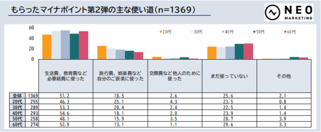 マイナポイントの使い道として生活費、教育費などに使ったとの回答が約半数となりました。また、旅行費や娯楽費など自分へのご褒美に使ったという方もいらっしゃるようです。