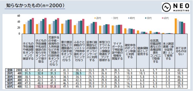 また、マイナンバーカードの活用方法として知らなかったものは「子どもの予防接種や検診歴をオンラインで確認する」、「子どもの予防接種や乳幼児健診のお知らせをオンラインで受け取る」、「児童手当の手続・保育所の入所申請など子育て関連の行政手続をオンラインで行なう」など、お子様関連の項目が上位となっています。マイナポータルの子育て関連の便利な機能は、まだ認知があまり高くないようです。