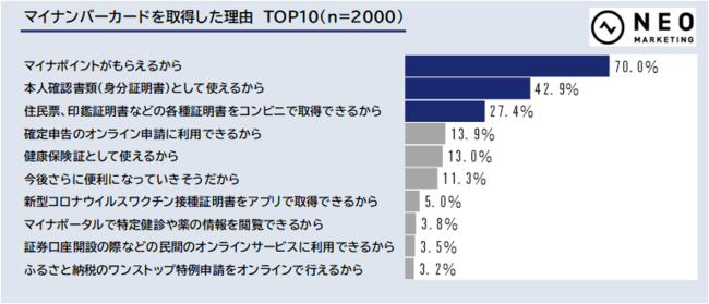 マイナンバーカードを取得した理由は「マイナポイントがもらえるから」70.0%が最も多く、次いで、「本人確認書類(身分証明書)として使えるから」42.9%、「住民票、印鑑証明書などの各種証明書をコンビニで取得できるから」27.4%と続く結果となっています。