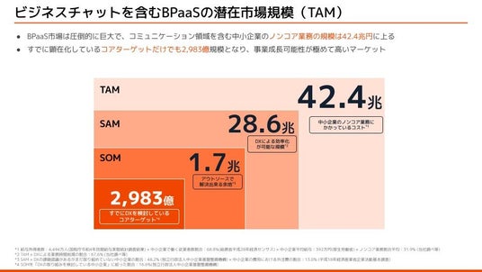こうしたマジョリティ市場において、業務プロセスそのものをクラウド経由で提供する「BPaaS(Business Process as a Service)」は、SaaSに続く次なる潮流として注目されています。SaaSを使いこなすのではなく、SaaSやAIを活用した業務運用自体をプロに託すことで、本質的な業務効率化を実現することが可能です。このBPaaSの潜在市場規模(TAM)は42兆円(*1)にのぼるとされ、すでにDXに課題意識を持つ顕在層だけでも約3,000億円(*4)規模の市場が存在しています。