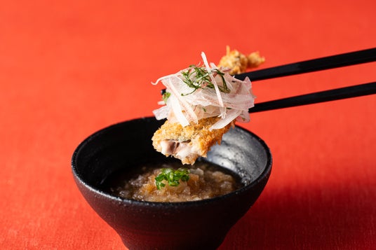 脂の乗った秋刀魚カツは、3種の薬味(大葉、みょうが、たまねぎ)をたっぷり乗せておろしポン酢やレモンでさっぱりとお召し上がりください。