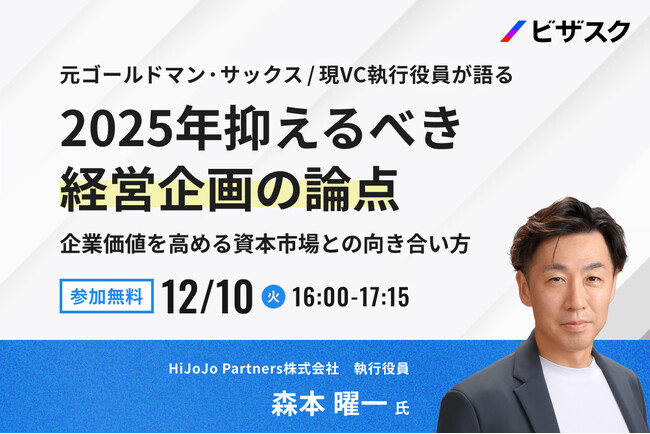 「知見と、挑戦をつなぐ」をミッションにグローバルなナレッジプラットフォームを運営する株式会社ビザスク(以下、当社)は、「元ゴールドマン・サックス / 現 VC 執行役員が語る 2025年抑えるべき経営企画の論点」をテーマに、HiJoJo Partners株式会社 執行役員 森本 曜一氏 ご登壇による無料オンラインセミナーを 12/10 (火) 16時より開催します。