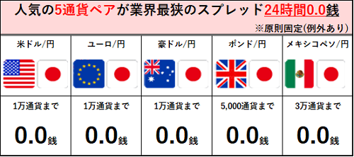 概要 :パートナーズFXnanoにおいて、「米ドル/円」・「ユーロ/円」・「豪ドル/円」は1回あたりの取引数量1万通貨まで、「ポンド/円」は1回あたりの注文数量5000通貨まで、「メキシコペソ/円」は1回あたりの注文数量3万通貨までのスプレッドを24時間「0.0銭」でお取引いただける業界初(※)のキャンペーン延長を決定いたしました。原則固定(例外あり)