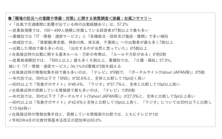 アスクル株式会社(本社:東京都江東区、代表取締役社長:吉岡晃)はこのたび、事業所向け(BtoB)サービス「ASKUL」(https://www.askul.co.jp/)に登録している事業所を対象に実施した「職場の防災への意識や準備・対策」に関する調査結果を「前編」「後編」に分けてまとめました。今回の「後編」では職場における台風接近時の出勤実態や職場のルール、その際の情報収集手段に関する調査結果を発表します。