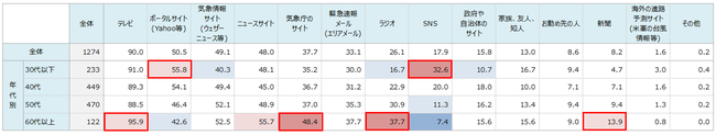 ・60代以上で「気象庁のサイト」が48.4%、「ラジオ」が37.7%と、全体と比較して10pt以上高く、