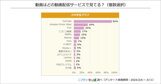 最も多かったのは「YouTube」で、94%の小中学生が利用していることがわかりました。続いて、「Amazon Prime Video」、「Tver」が上位でした。有料の動画配信サービスの中でも「Amazon Prime Video」が上位に入ったのは、他のサービスに比べて安価なことが理由と考えられます。