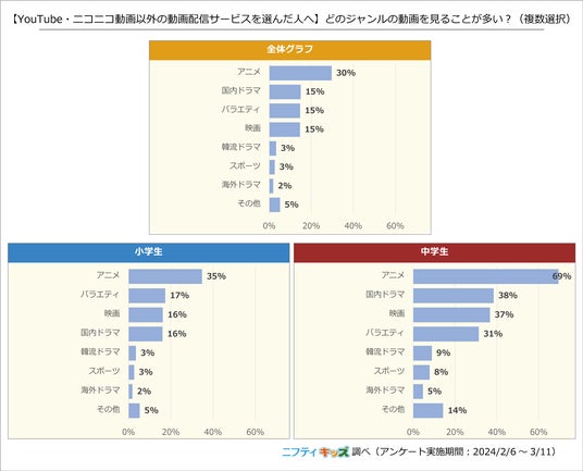 小中学生ともに「アニメ」が1位でした。中学生ではアニメを視聴している割合が69%と小学生の35%に比べて大きく差が出ました。